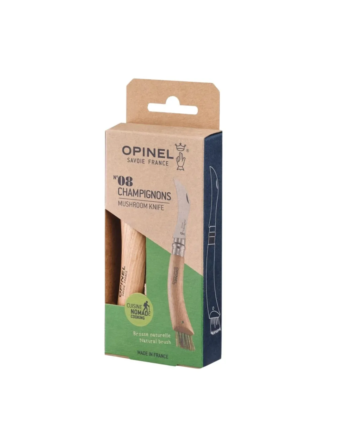 Das Lieblingswerkzeug vieler Pilzsammler, das Opinel N°08 Champignon, ist der ideale Begleiter für Naturbeobachter im Wald. Die gebogene Klinge aus rostfreiem Stahl, der gezahnte Klingenrücken und die Naturborstenbürste am Griffende ermöglichen ein sauberes Schneiden, Säubern und Abkehren von Morcheln, Steinpilzen, Pfifferlingen und vielen weiteren Pilzarten.