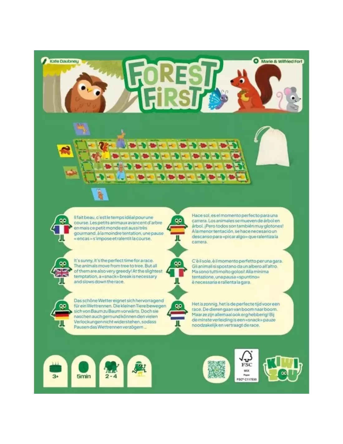 Dans Forest First, les joueurs deviennent des animaux de la forêt lancés dans une course folle jusqu'au bout de leur ligne ! Pas de dés ni de cases à compter : une tuile couleur tirée désigne l’arbre où avancer.