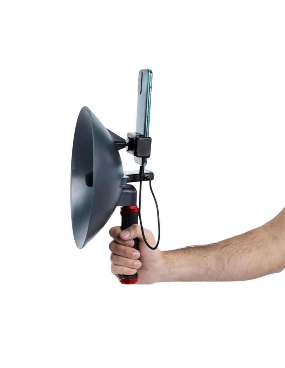 - Microphone: omnidirectional, high-sensitivity element positioned at the parabolic focal point.
