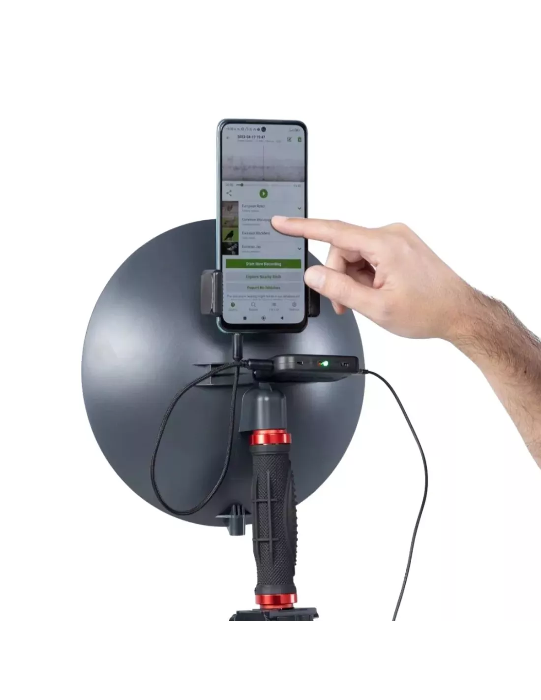 The BirdMic ONE pack includes everything you need to fully enjoy nature’s sounds: a parabolic microphone, an integrated audio interface, and headphones. Designed for direct use with a smartphone—no additional device required—it allows you to listen in real time, make high-quality recordings, and use bird identification apps to recognize species instantly.