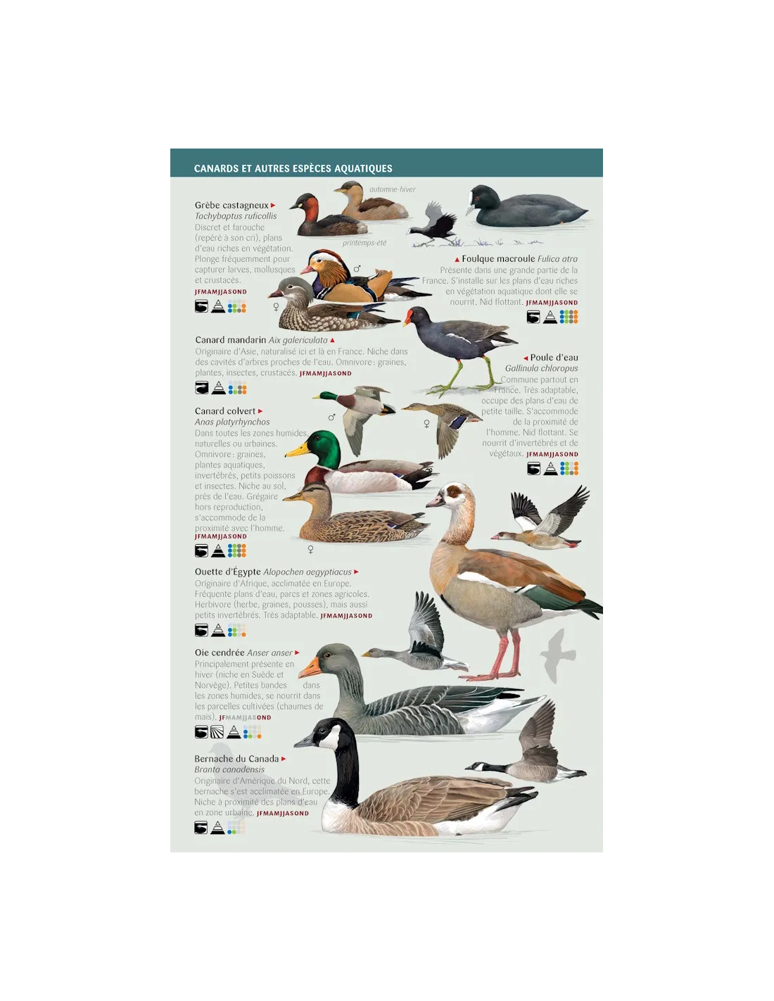 En cada lámina, las especies se ilustran a escala, acompañadas de un breve texto y de algunos iconos con información complementaria muy útil para facilitar su localización e identificación. Las aves de los bosques y las montañas, de los medios acuáticos, así como las rapaces y las aves marinas serán objeto de otras miniguías.