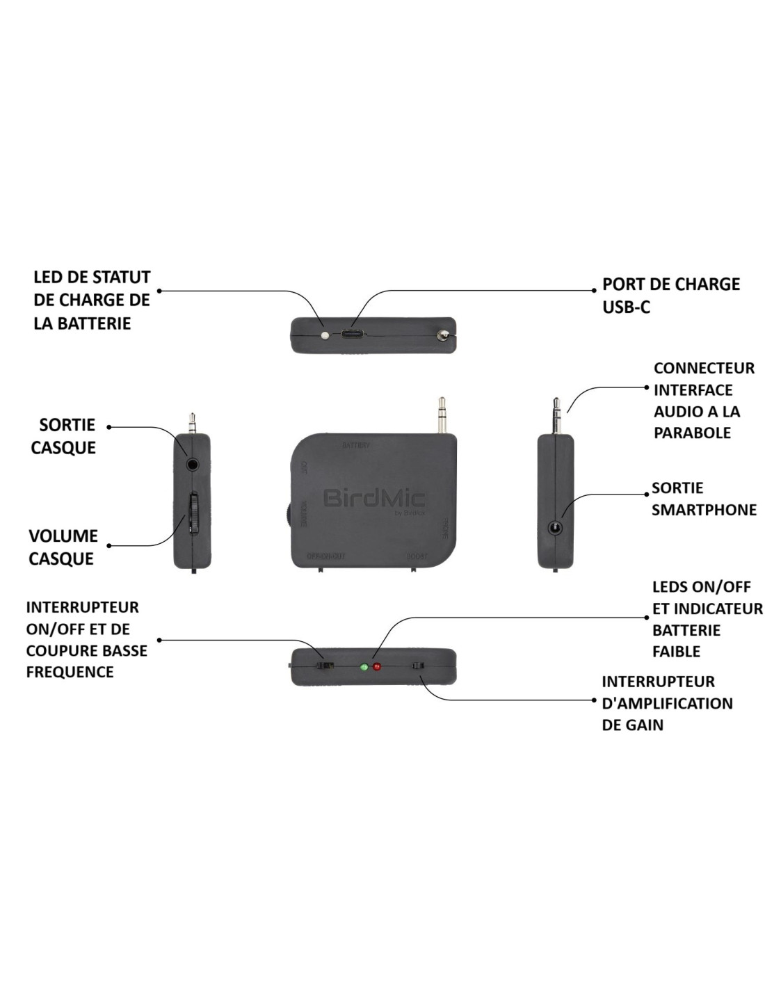 L'interface audio Birdmic utilise une batterie lithium-ion rechargeable avec n'importe quel chargeur de téléphone portable standard (SORTIE 5,3V - 2,0A).