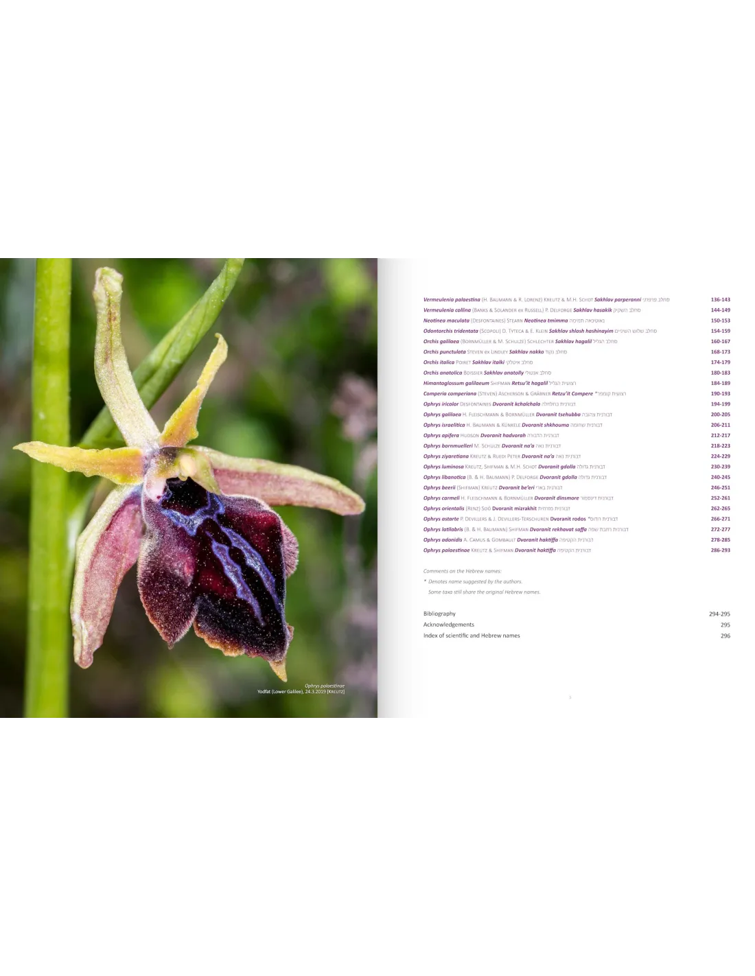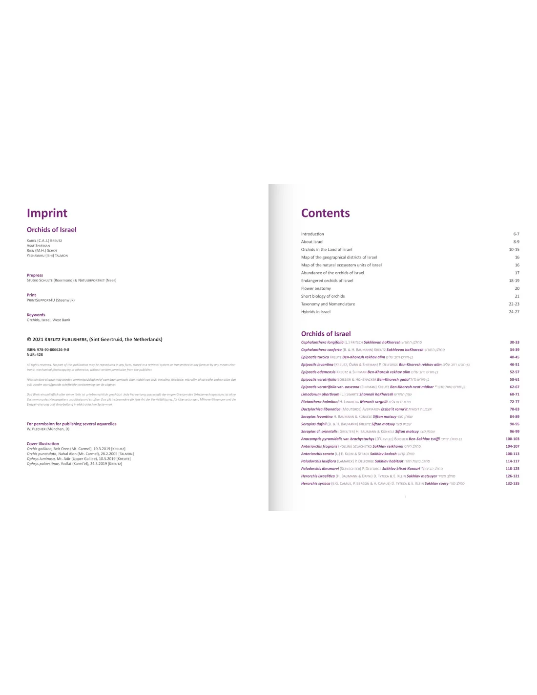 Orchidées d'Israël présente la première vue d'ensemble de tous les taxons distinguables d'Israël avec leurs noms scientifiques, leurs basionymes, les synonymes les plus importants, les informations sur les types, les étymologies, les descriptions, les périodes de floraison, les habitats, les altitudes et les répartitions.